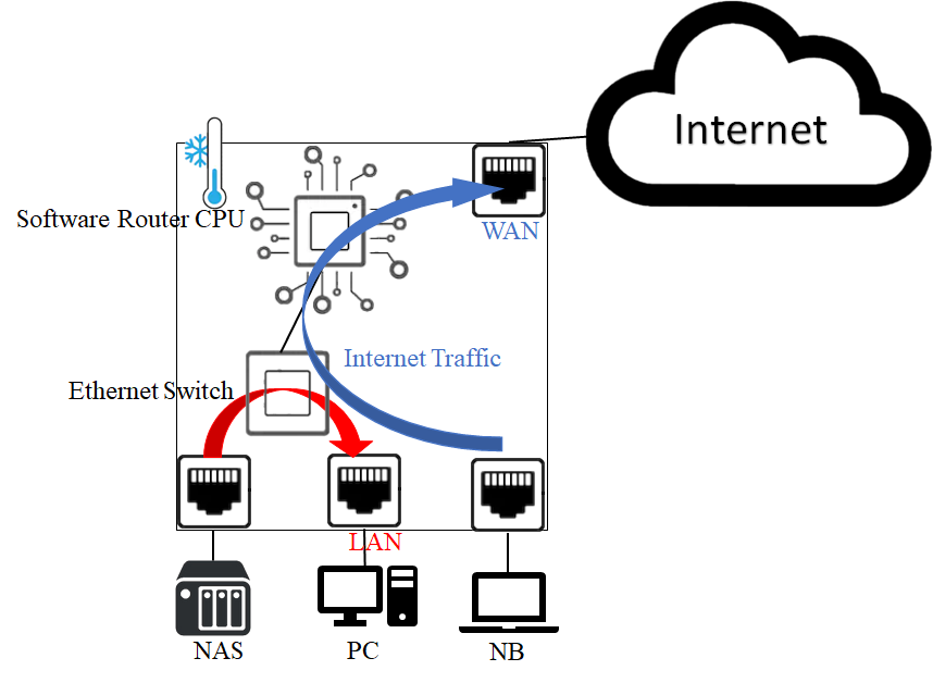 因此我們針對軟路由LAN端的應用,在network interface controller之上添加了Ethernet switch chip 去減輕CPU的負擔,讓CPU可以處理其他更多的應用,如下圖所示我們可以看到在LAN之間傳輸封包不會經過CPU